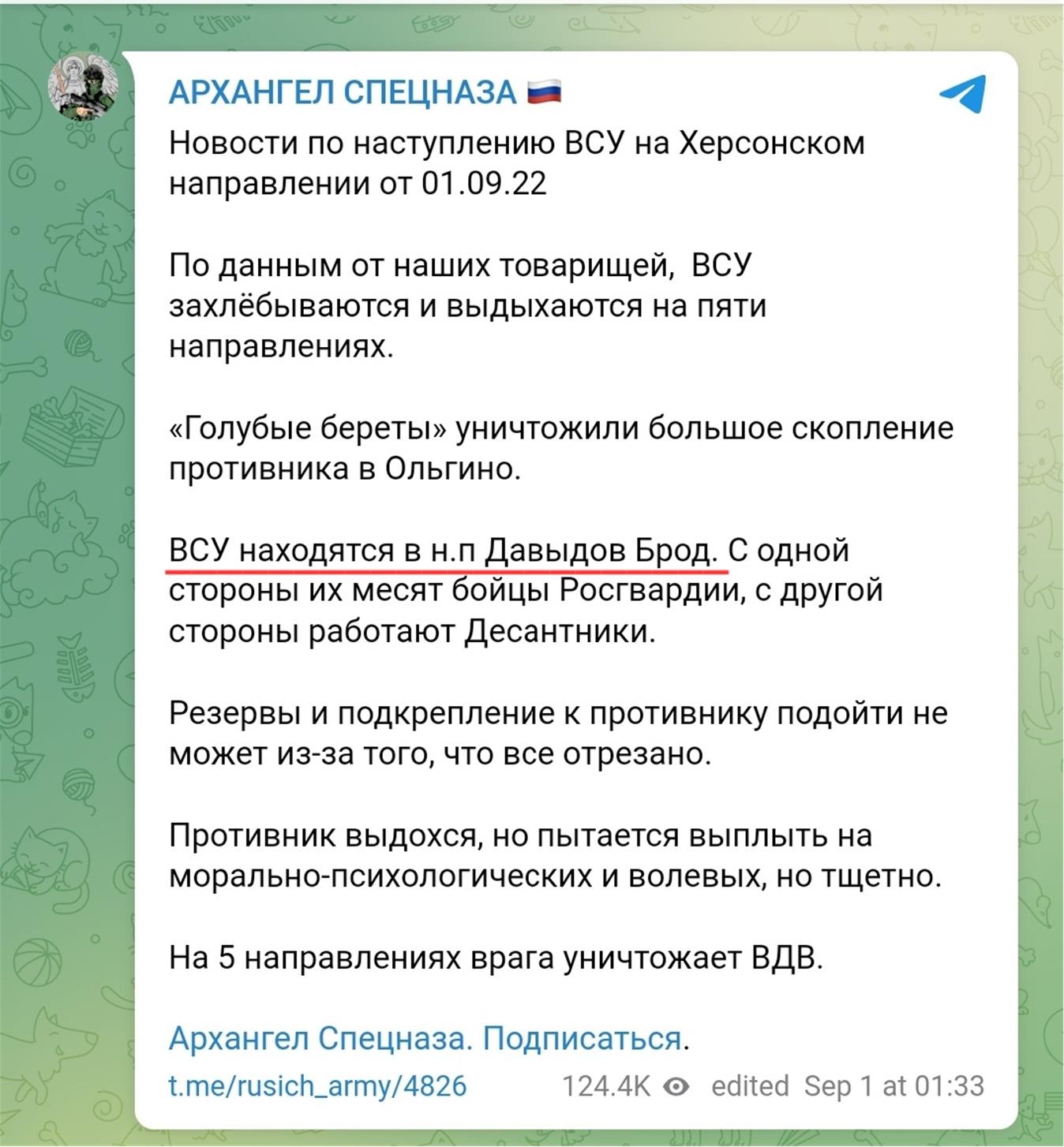 Ukraina täielik infosulg kannab vilja. Erinevatest sotsmeedia kanalitest tuleb infi, et vene blogijad ja infokanalid otsivad paaniliselt informatsiooni Ukraina vägede ja rinnete olukorra kohta. Esimest korda kogu sõja jooksul nägin eile Zelensky teadet, et tema kui sõjaväe ülemjuhataja kutsus kokku sõjaväe kõrgemad juhid nõupidamisele. Kindlasti toimub neid nõupidamisi igal nädalal aga sellest teatamisi on siiani ainult üks? Osa infooperatsioonist või suurem pealetung? Euroopa analüütikud Ukraine War Mapperist kirjutavad, et Harkivi alla on koonduvad UA väed. Mitmed kanalid räägivad, et rinnetele on saabunud pikalt ettevalmistatud UA uued üksused. Vene „Arhangel Spetsnaza“ telegrammi kanal räägib russistide kangelaslikust kaitsest Davydiv Brid asulas kus ühel suunal kaitsevad dessantnikud ja teisel rosgvardia. See aga viitab, et ukrainlased on tõenäoliselt T2207 mööda okupantide tagalasse jõudnud. Vaenlase paanika on olnud alati kasulik liitlane nagu näitab sõdade ajalugu.