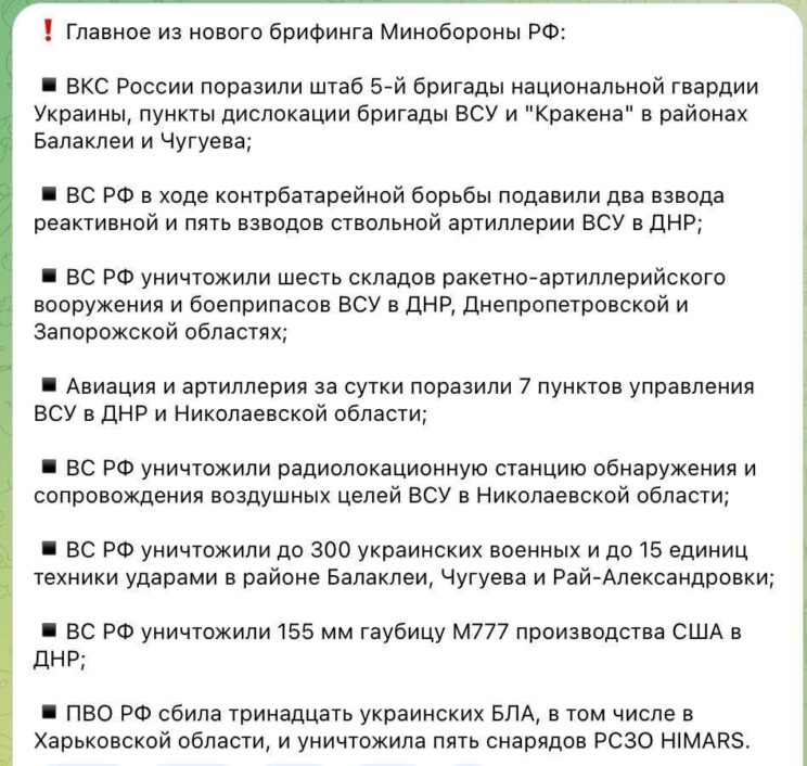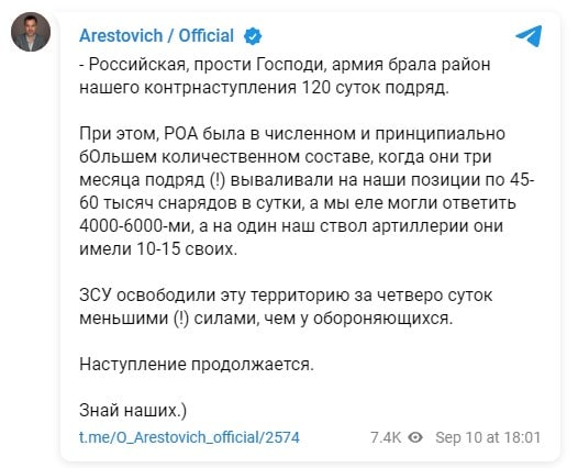- Balakalija ründamise järel ütles Arestovich, et saak oli rasvane. Nüüd ühest UA allikast on ilmunud selline teade. Alates 7. septembrist kuni 10. septembrini on Venemaa sõjaline abi Ukrainale järgmine: