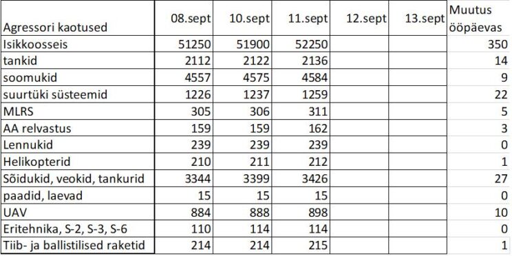 Operatiiv- ja sõjaga seotud info 10. Septembril
