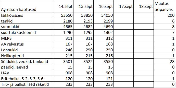 Vene väed korraldasid piiratud maapealseid rünnakuid ja tugevdavad positsioone idateljel. Agressori eesmärk on jätkuvalt Donetski oblast täielikult okupeerida. Putleri antud tähtaeg Donbassi okupeerimiseks, 15 september, on eilne päev.  Vaenlane andis 11 raketi- ja 15 õhulööki ning tulistas 96 reaktiivmürsku Ukraina territooriumil asuvate objektide pihta. Ukraina kaitsejõud tõrjusid edukalt rünnakud Odradivka, Zaitseve, Bahmuti, Vesela Dolyna, Avdiivka ja Novomõhhailivka piirkonnas. Ukraina väed jätkasid vastupealetungi Ida-Ukrainas. UA on hõivanud Dibrova Lymanist lõuna pool ja taastanud kontrolli Spirne’i üle, Sivers’kist kagus.