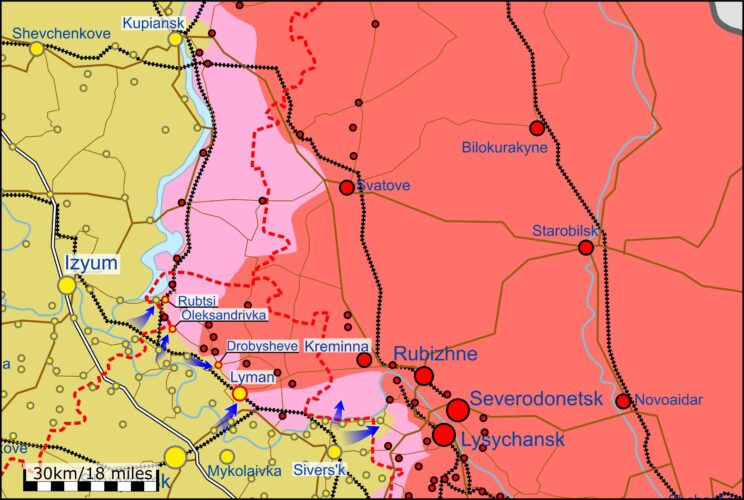 • Tõenäoliselt jätkasid Ukraina väed Lymani ümbruses pealetungioperatsioone. Drobysheve on nüüd vaidlustatud.