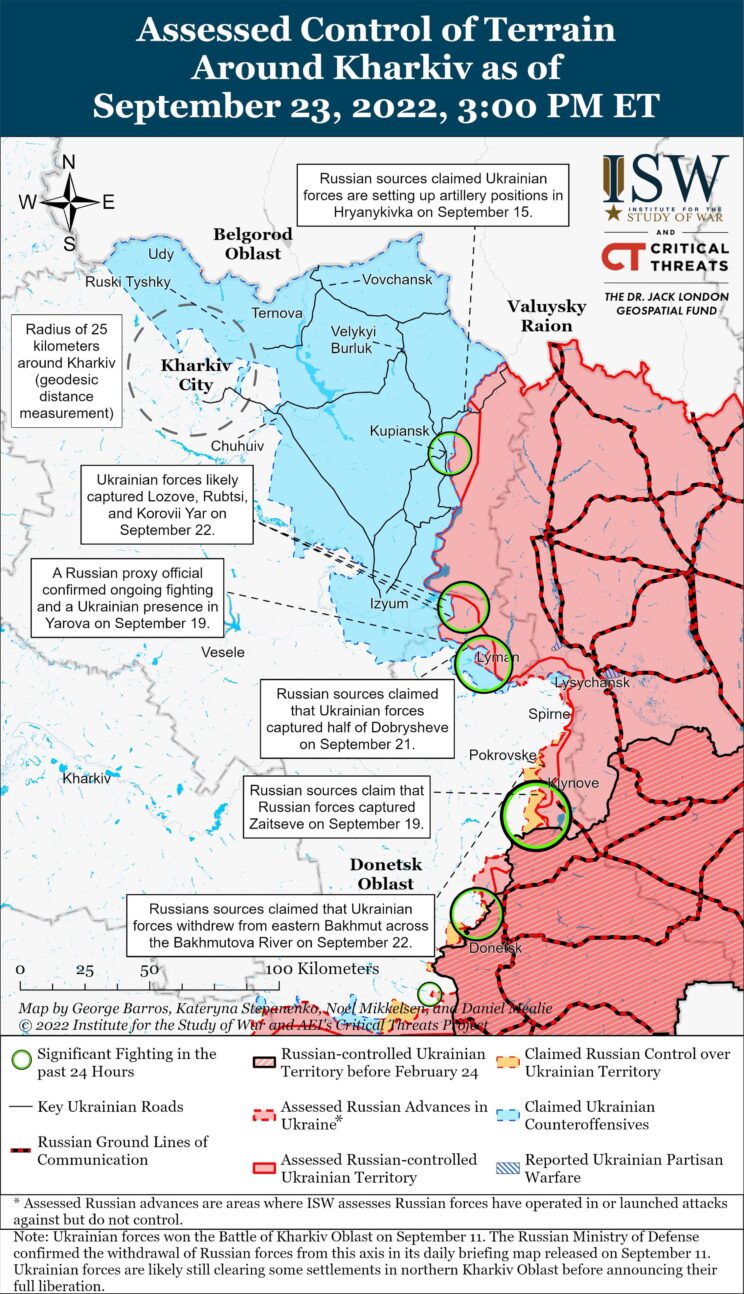 Okupeeritud Ukraina territooriumil korraldab okupatsioonivõim nn “referendumi”. “Hääletamisjaoskondades” osalemise madala protsendi tõttu koguvad “hääletamiskomisjonide” töötajad koos okupatsiooniarmee relvastatud sõduritega kohalike elanike allkirju otse nende elukohas. Zaporižžja ja Hersoni oblastis hakkasid okupatsioonivõimud väljastama mobilisatsioonikutseid Ukraina kodakondsusest teenistusealistele meestele, kes said Vene Föderatsiooni passid.