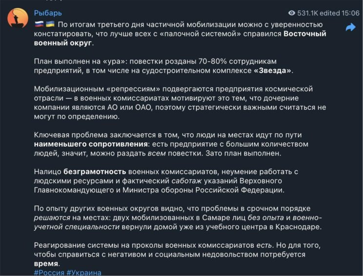 • Jakuutiast tuleb inf, et esimesest mobiliseeritute lainest mis Habarovskisse saadeti, lendab tagasi. Pole tervise ja vanusega sobilikud. Seoses paljude rikkumistega on mob peatatud. Ukaasi järgsed kiirus ja kogused on täitmata. Ukaasis olid ka kategooriad ja seda ei järgitud. Esimeses laines pidid olema kuni 35 aastased sõdurid, seersandid ja veeblid ning kuni 50 aastased ohvitserid. Prokuratuur on juba algatamas asju mob ametnike vastu kuna on kogutud kurte, pimedaid, teenistuses mitte käinuid ja ka poisikesi. Fotol veel üks näide. Sõjatööstus ettevõtete töölised läksid ka ida ringkonnas loosi