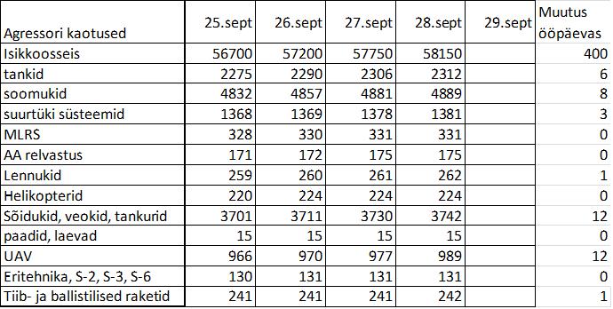 Ukraina väed suruvad peale Luganski oblasti suunas ja vabastavad ühe asula teise järel. Lymani kaitsvate agressori vägede olukord muutub kriitiliseks. Teisipäeval lõppesid Venemaa võltsreferendumid, kus enamik valijaid pooldas Venemaaga ühinemist. Putler teatab tõenäoliselt okupeeritud Ukraina territooriumi annekteerimisest 30. septembril. Venemaa võib üritada oma sissetungi Ukrainasse ja peagi annekteeritava Ukraina territooriumi okupeerimist ümber sõnastada “terrorismivastaseks operatsiooniks”.