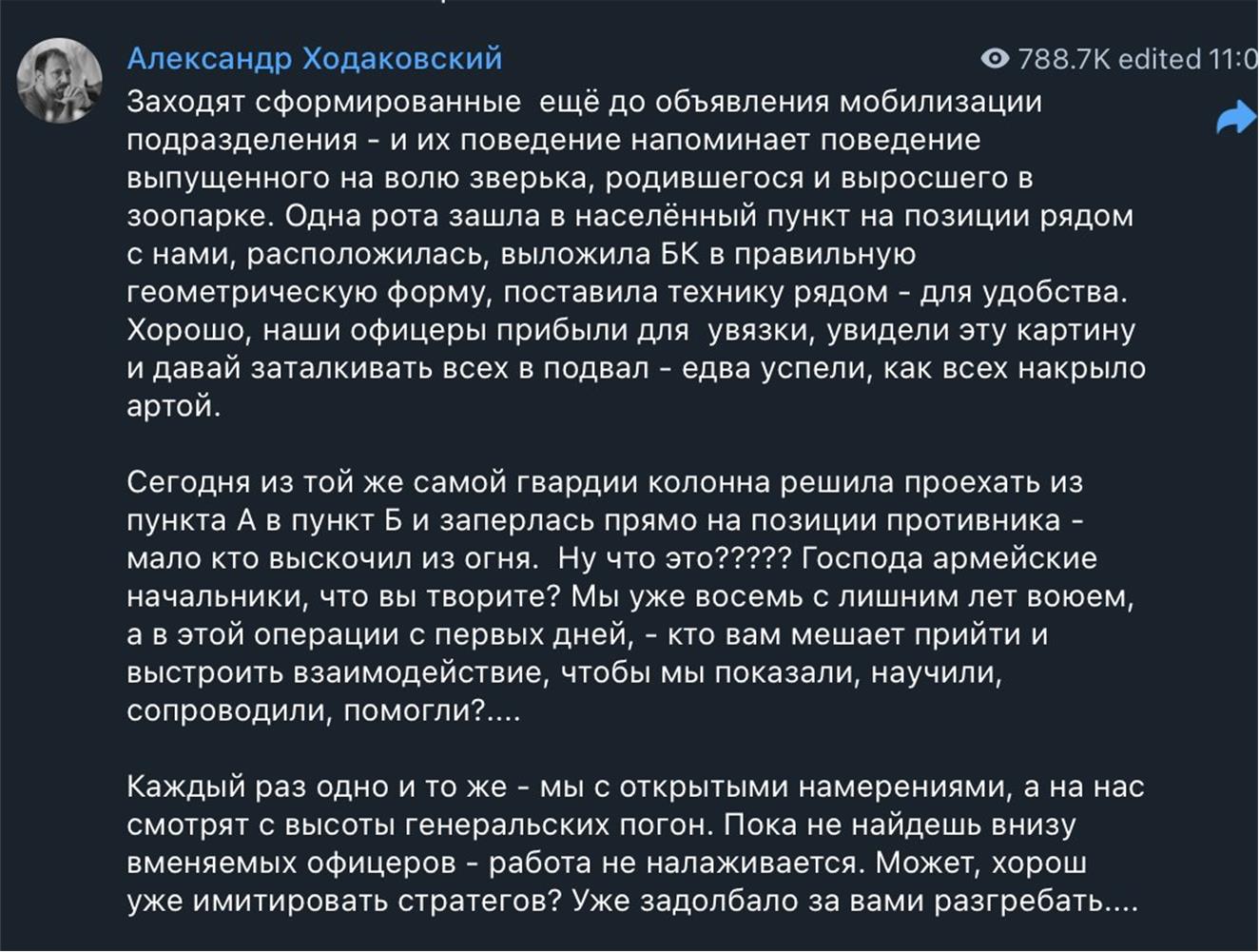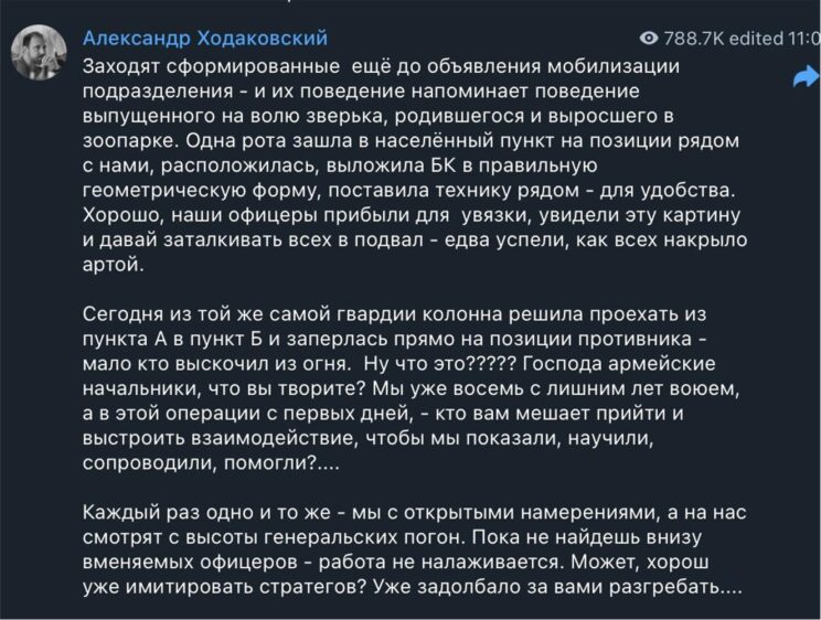 - Venemeelne Vostok pataljoni komandör Aleksandr Hodakovski räägib kohutavast olukorrast mobikutega, kes teevad hullumeelseid asju nagu sõidavad vaenlase positsioonidele ja asetavad tehnika lagedale. Süüdistab kindraleid korraliku meeskonnatöö mitteloomises.