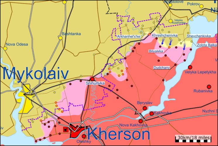 Hersoni piirkonnas võttis UA oma kontrolli alla Arkhanhelski, Hreshchenivka, Shevchenkivka Ljubõmivka, ja Zolota Balka asulad. Ru põhikaitseliin on taandunud Dudchanysse ja Mõkailivka ümbruses.