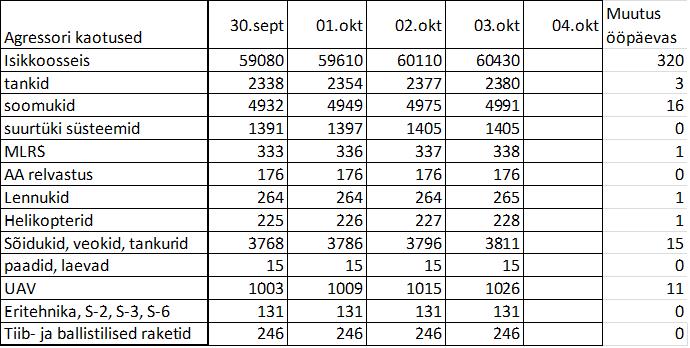 Operatiiv- ja sõjaga seotud info 03. Oktoobril