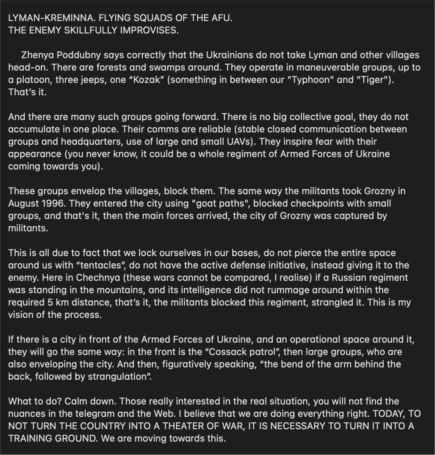 - Venelased tutvustavad ukrainlaste taktikat linnade võtmisel. Kiired võitlusgrupid, võtavad positsioonid sisse ümber asula, tulistavad ründajaid. Inglise keelse kirjelduse leiate fotolt. Üks, mida ma selles ei märganud, oli suurtükiväe roll. Varasemast russistide hädaldamisest vist Hersoni kandis kurdeti, et kui ukrainlased suurtükitule tellivas siis see ka kohe tuleb ja on täpne. Ilmselt on nii ka idas.