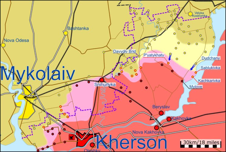 Vene väed jätkasid ebaõnnestunud katseid taastada hiljuti kaotatud territoorium Loode-Hersoni oblastis, tugevdades samas lähedalasuvaid positsioone kahjustatud ja kiiruga mobiliseeritud üksustega. Hersoni oblastis käivad lahingud Pjatykhatõ, Sablukivka ja Kachkarivka asulate piirkonnas kus UA korraldab rünnakuid uutele ru kaitseliinidele.