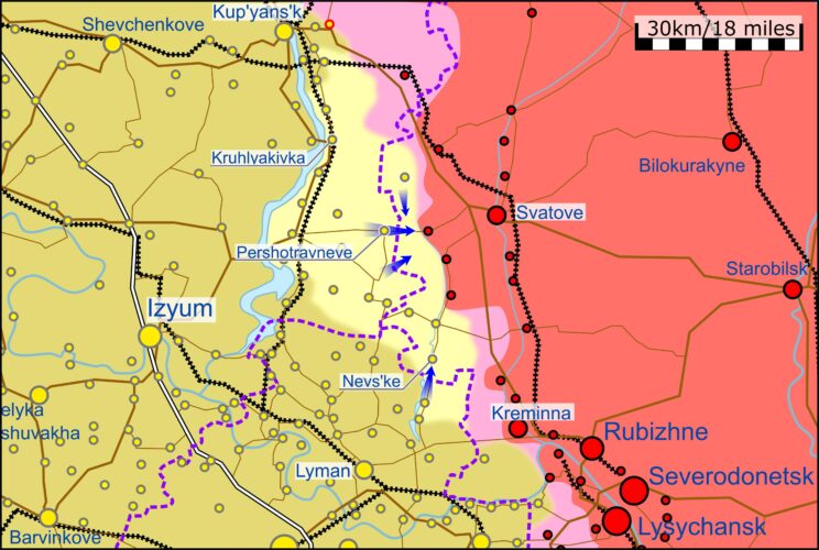Ukraina väed on 10. oktoobri seisuga tõenäoliselt vabastanud üle 200 ruutkilomeetri territooriumi Lääne-Luganski oblastis. UA üksused jätkavad liikumist Svatove suunas, võttes tagasi kontrolli Pershotravneve ja Nevs’ke asulate üle.