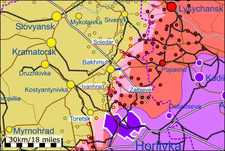 Ukraina ja vene allikad teatasid lahingutest Ida-Ukrainas Siverski, Soledari, Bahmuti, Avdiivka ja Marinka lähedal. Vene KM väitis, et Vene väed tõrjusid Ukraina maapealsed rünnakud Donetski oblasti lääneosas. Allikate sõnul on UA tõrjunud ru Bahmuti servast eemale tagasi kiirteele (ca 2km). Vene allikad väitsid, et Ukraina väed viisid läbi vasturünnakuoperatsioone Kreminna ja Svatove suunas.