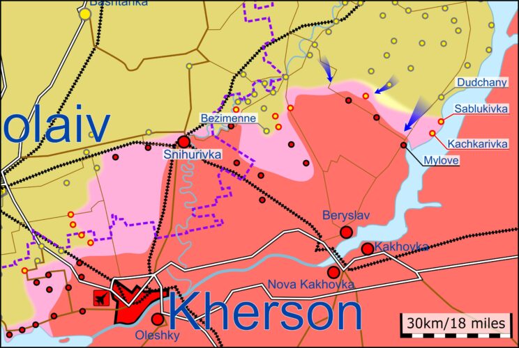 Vene väed valmistuvad tõenäoliselt Hersoni linna kaitsmiseks ega tagane täielikult Hersoni piirkonnast, hoolimata varasematest kinnitatud teadetest, et mõned Vene elemendid taganevad Hersoni piirkonnast. Käimas on meetmed kohalike elanike evakueerimiseks ajutiselt okupeeritud Hersonist. Linna paremkaldalt Henitšeski ja Skadovski asulatesse viidi välja kõigi pankade ning okupatsioonivalitsuse tehnika ja personal. Kiirabi ja meditsiinitöötajad kuuluvad evakueerimisele. Olemasolevatel andmetel rajab okupant kaitsepositsioone Dnepri vasakul kaldal Hersoni oblastis. Näiteks Hornostayivka asula piirkonnas mineerivad Venemaa okupatsioonivägede inseneri- ja sapööriüksused rannajoont, jättes väikesed läbikäigud oma vägede võimalikuks taganemiseks paremkaldalt. Hersoni oblastis on kinnitatud, et Bezimenne on täielikult UA kontrolli all.