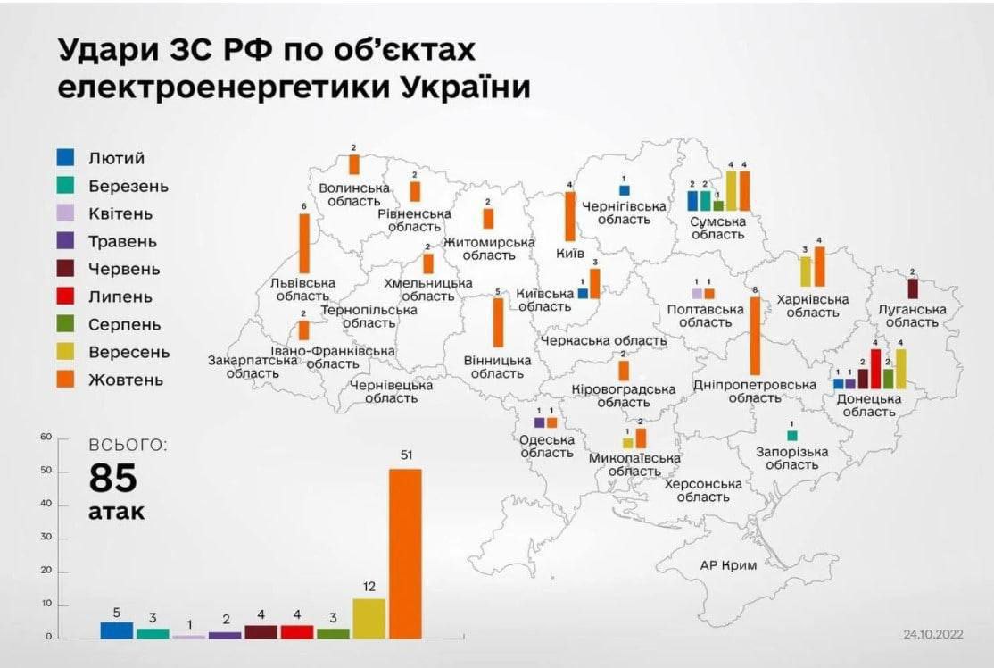 • Venemaa Föderatsioon korraldas 8 kuu jooksul 85 rünnakut Ukraina elektriobjektidele. Neist 51 oktoobris. Kõige rohkem streike kriitilise infrastruktuuri objektidele anti Dnipropetrovski oblastis – 8, Lvivi oblastis – 6, Vinnõtsja oblastis – 5, Sumõ oblastis – 4, Harkivi oblastis – 4 ja Kiievi oblastis – 4.