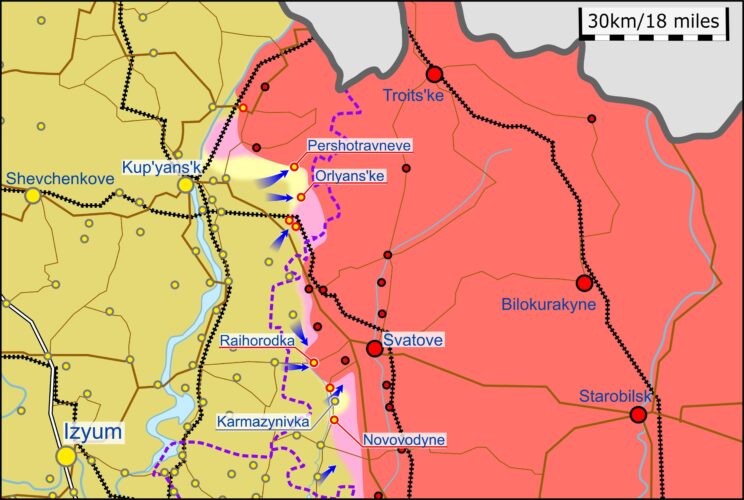 Vene allikad väitsid, et Ukraina väed viisid Svatovest läänes läbi vasturünnaku operatsioone. UA on jätkanud idas edenemist ja praegu käivad lahingud Pershotravneve (Kupjanskist ida pool) ja Raihorodka (Svatovest läänes) asulate pärast.
