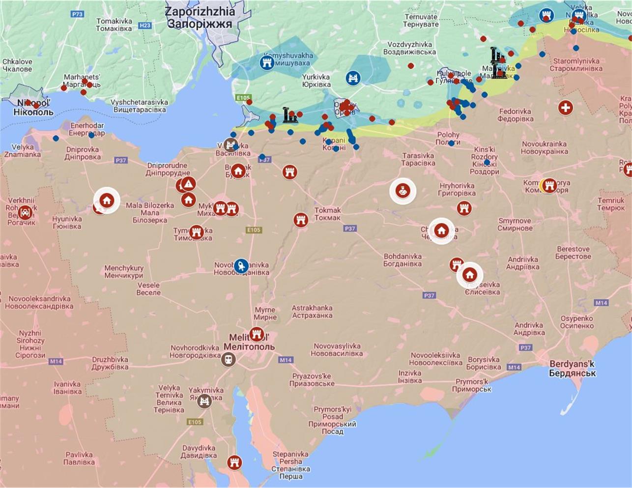 • Andrew Perpetua jagab Twitteris infot, et Vene sõdurid kolivad majadesse üle kogu Zaporižžja oblasti. Kaardil märgitud neljast asustatud punktist tuli info eile.Ma arvan, et „vene karu“ otsib talvekoobast. Siit ka ilmselt elanike evakueerimine jms. Info liigub ka lasteaedade ja koolide tühjendamisest.