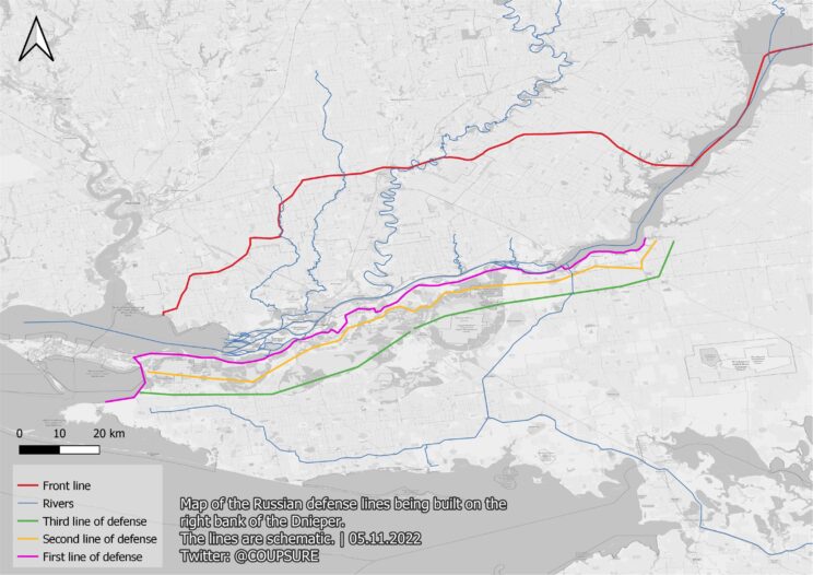 Venelased ise näitavad välja kahesuguseid märke; Hersoni oblasti “okupatsiooni administratsioon” koliti Skadovskisse, elanikkonda evakueeritakse, Berislavis hävitati eile-täna elektriliine ning kohalikele elanikele anti korraldus piirkonnast 10 novembriks lahkuda, Lenini kuju viidi Melitopolisse ja mitmed muud sambad okupeeritud territooriumile, rüüstamine ja varade liigutamine idakalda suunas käib hoogsalt. Hersoni administratiivhoonelt kadus vene lipp ja idakaldale ehitatakse kolme kaitseliini betoonist laskepesadega. Need märgid viitavad, et valmistutakse idakalda kaitseks ja läänest lahkuma. Vastupidiselt käib jällegi positsioonide kindlustamine läänekaldal Kahhovka veehoidlast kuni Dnepri suudmeni ning läänekaldale on viidud täiendavaid üksuseid. Kindlustatud tsooni laius on 15 km.  Arestovichi nädala alguses jagatud info järgi tuuakse sinna värskeid üksuseid juurde ning kokku on seal juba üle 30 lahingugrupi. Arvatavalt siis 30K suurune kontingent. Sealhulgas merejalaväe ja õhudessant üksused mis on olnud Hersoni oblastis sõja algusest peale. Kahhovka tammi lüüside hävitamine tooks venelastele kasu üksnes siis kui nad oma väed läänekaldalt tagasi tõmbaksid. Samuti on küsitav mõne pargase hävitamine läänekaldal mille kohta eile info liikus. Sedasi jääb vene läänekalda väegrupp üksnes helikopterite toetusest sõltuma. Seega küsimusi tekib ja venelaste kavatsused pole selged. Spekuleeritakse ka lõksust mis ilmselt tähendaks ukrainlaste meelitamist tule alla.