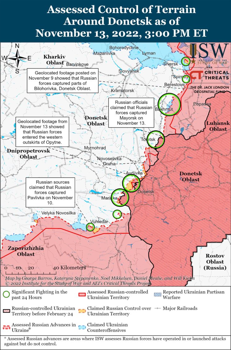 Hersoni piirkonna vabastatud asulad säilitavad kõrge miiniohu taseme. Õhuluure vastase poolt on pidev, mis võib viidata sellele, et see on kavandanud tulelööke nii militaar- kui ka tsiviilobjektidele. Kaitseväe üksused jätkavad stabiliseerimismeetmete elluviimist. Olemasolevatel andmetel sooritasid vene okupandid 12. novembril rünnaku Gornostayivka Hersoni oblasti asula erasektoris, mille elanikud keeldusid nn evakueerimisest. Tulistamise tagajärjel hukkus kaks ja sai vigastada kolm kohalikku elanikku.