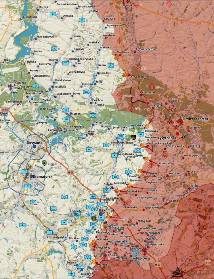 Vene väed jätkasid pealetungioperatsioone Bahmuti ja Avdiivka–Donetski linna piirkonnas tugevdasid positsioone Svatove lähedal ja korraldasid vasturünnakuid Kreminna lähedal. Agressor keskendub Bahmuti ümbrusele ja avaldab survet seal paiknevatele Ukraina vägedele. Ohvreid jätkub mõlemal poolel, kuid tundub, et venelased on linna vallutamiseks valmis palju ohverdama. Ukraina väejuhatus on kaitse tugevdamiseks ja kurnatud üksuste väljavahetamiseks ümber paigutanud mitu üksust Hersonist Donbassi.