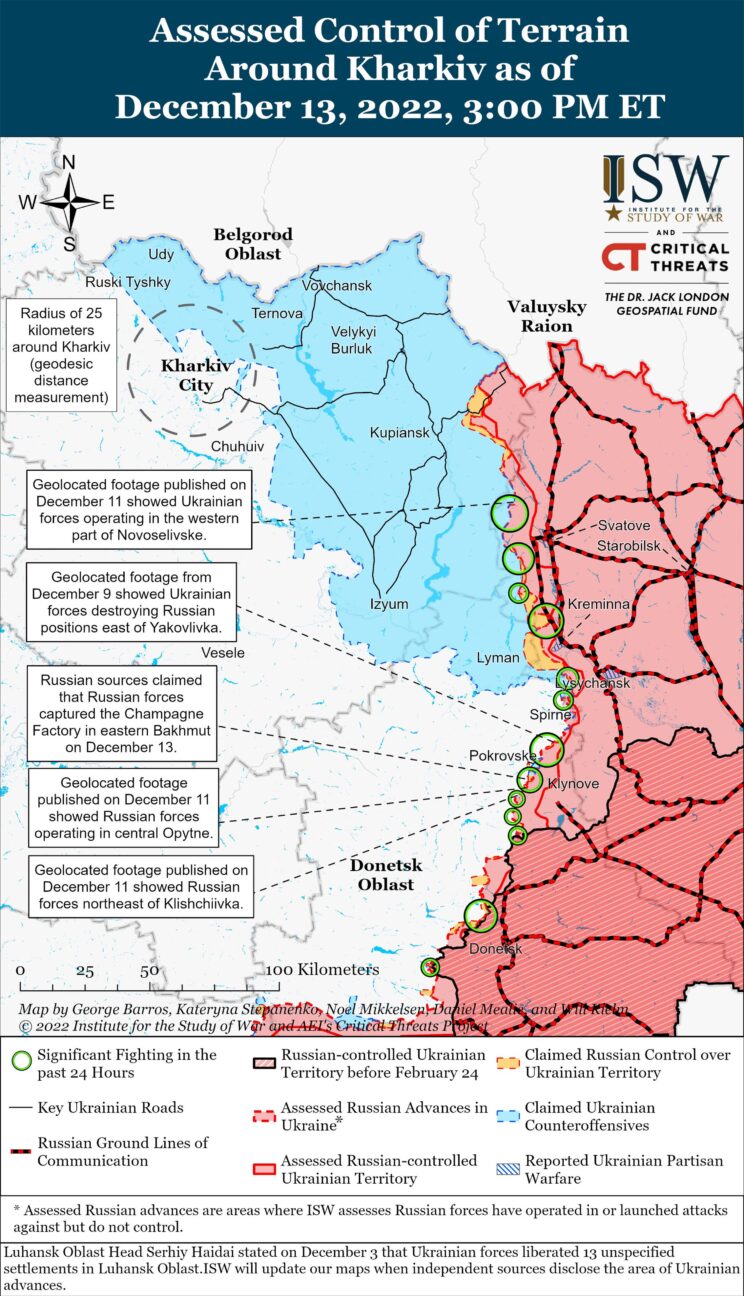 Vene väed tegid Bakhmuti piires marginaalseid edusamme ja jätkasid maapealseid rünnakuid Avdiivka ja Vuhledari lähedal ning korraldasid Svatove ja Kreminna lähedal piiratud vasturünnakuid.
