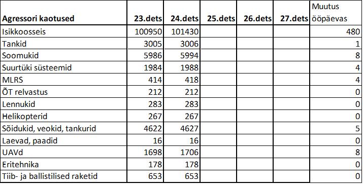 Vastane kannatab jätkuvalt kaotusi. 22. detsembril hävitas kaitsevägi Zaporižžja oblastis 2 suurtükiväesüsteemi. Vigastada sai üle 70 vaenlase sõduri. Info likvideeritud sissetungijate kohta on täpsustamisel.