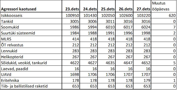 Operatiiv- ja sõjaga seotud info 27. detsembril
