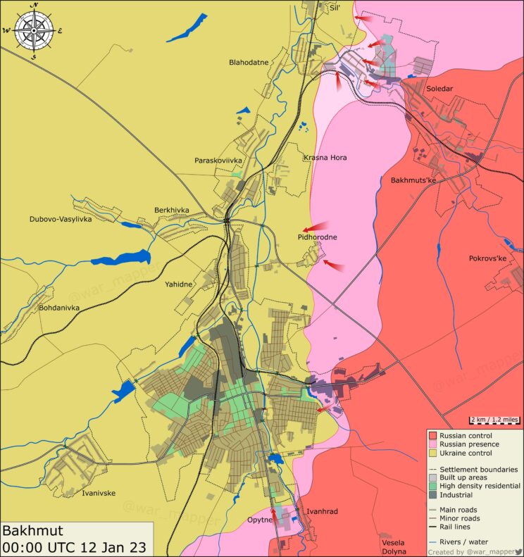 Vene väed pole vaatamata Venemaa hiljutistele edusammudele Soledari veel täielikult vallutanud ning tõenäoliselt ei võimalda Soledari võimalik hõivamine Vene vägedel Bahmuti vallutada. Vene väed korraldasid maapealseid rünnakuid üle Donetski oblasti rindejoone.