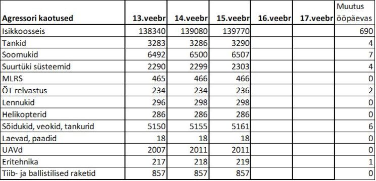 Operatiiv- ja sõjaga seotud info 15. veebruaril