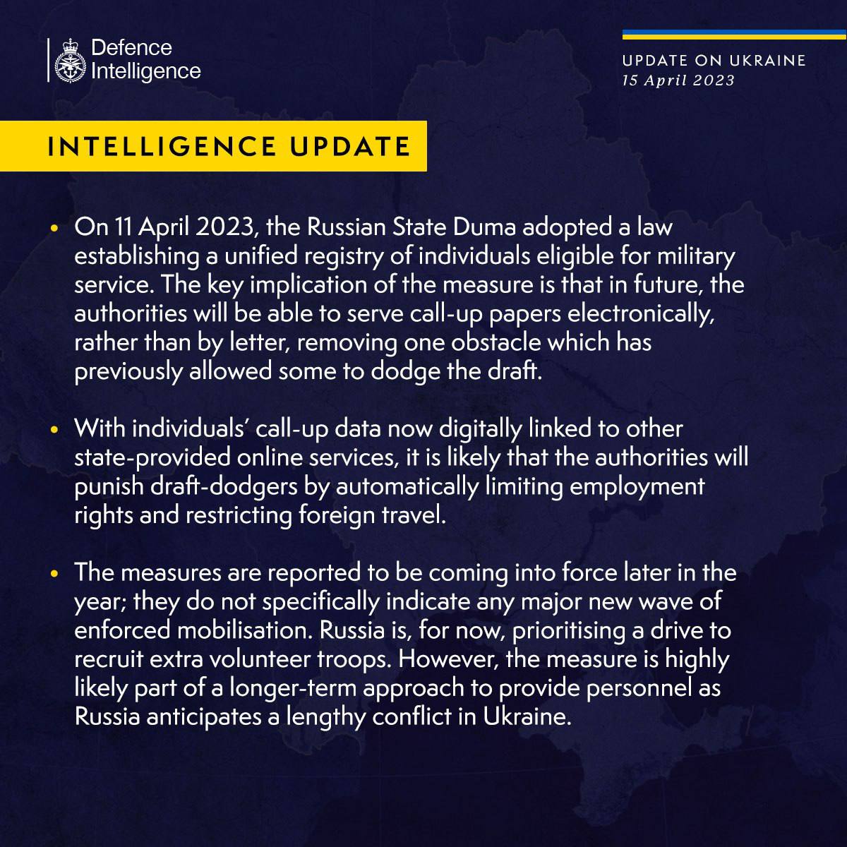• Briti luureraport.Venemaal võeti kasutusele ühtne ajateenijate register, et tagada isikkoosseisu pidev sissevool – Briti luureNii võeti 11. aprillil vastu seadus ajateenijate ühtse registri loomise kohta ning edaspidi hakatakse kutseid kätte toimetama elektroonilisel kujul.Luurekogukond usub, et kuna ajateenija andmed on nüüdsest kättesaadavad digitaalsel kujul ja lingitud teiste veebiteenustega, võimaldab see kõrvalehoidjaid karistada, piirates automaatselt nende töö- ja reisiõigusi.