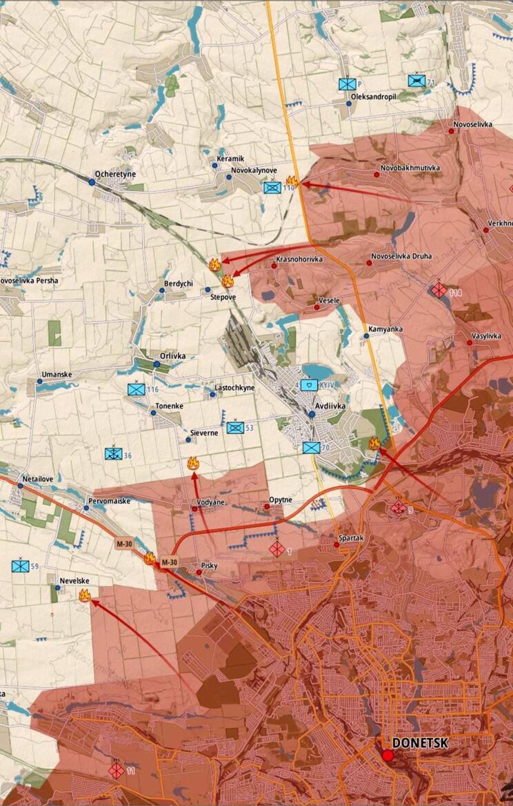 - Avdiivka suunal Ukraina kindralstaap teatab rünnakute tõrjumisest järgmistes piirkondades: Novokalynove, Stepove, Berdychi, Avdiivka, Sieverne, Pervomaiske, Nevelske.