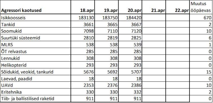 Operatiiv- ja sõjaga seotud info 20. aprillil
