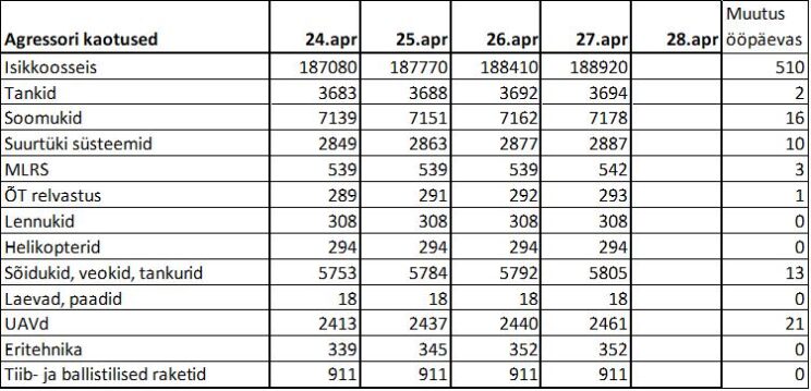 Operatiiv- ja sõjaga seotud info 27. aprillil