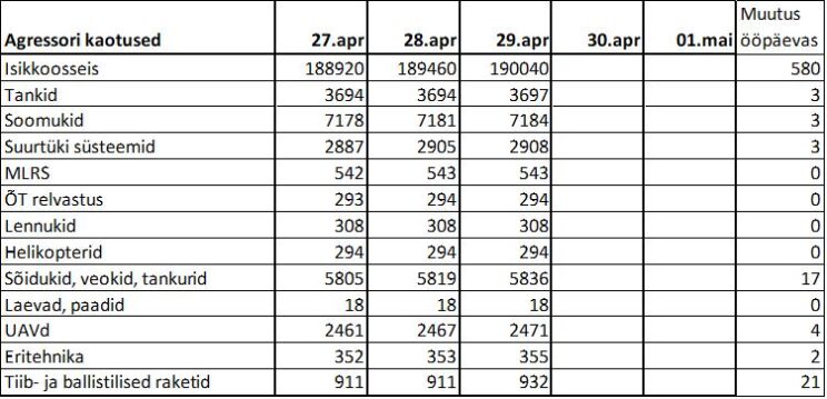 Operatiiv- ja sõjaga seotud info 29. aprillil