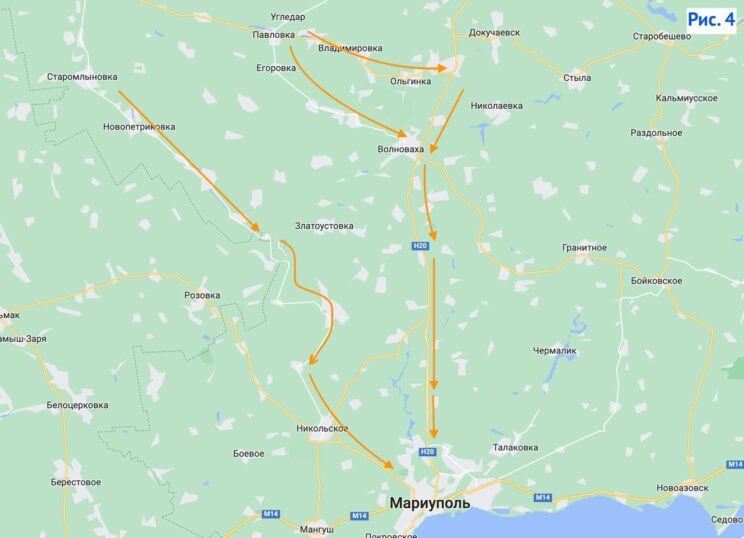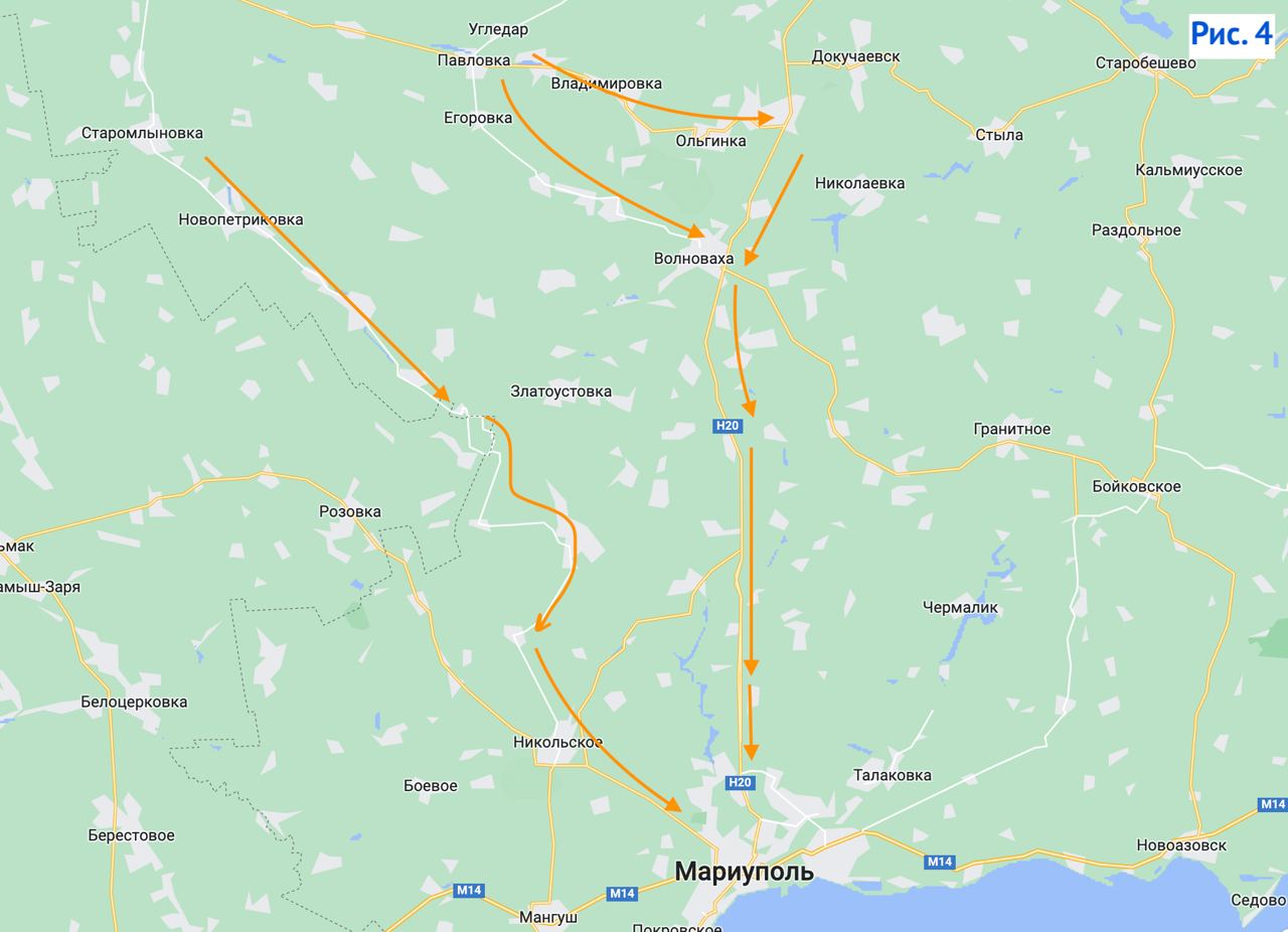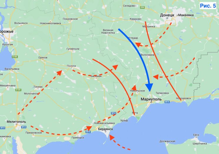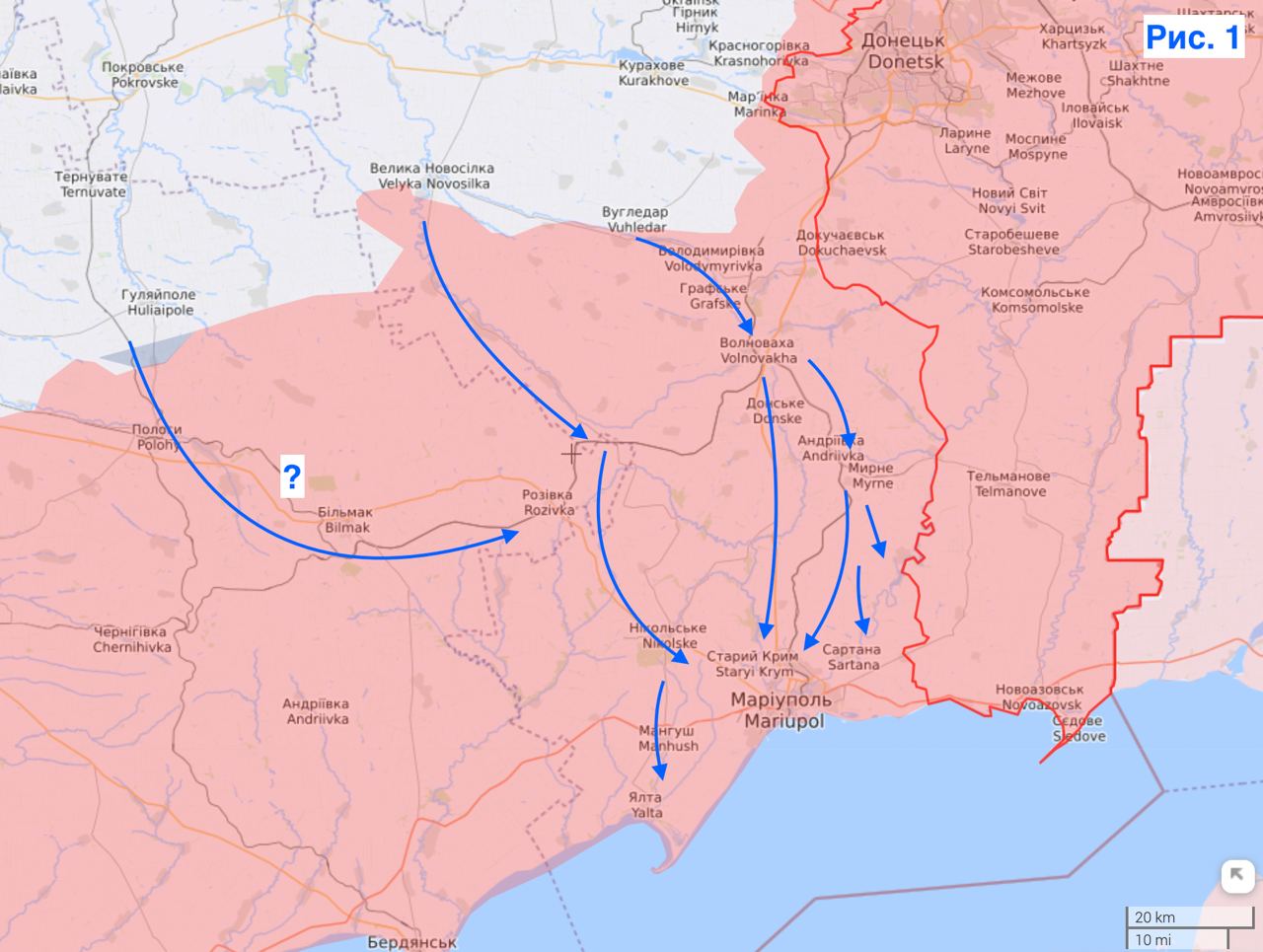 Kui variandil Melitopoliga on Krimm kõrgeim eesmärk, siis Mariupol ise on Ukraina relvajõudude jaoks uskumatult oluline eesmärk. Viimse lõpuni vastu pidanud ja barbaarselt hävitatud linna vabastamine on liialdamata vägitükk. Ja varem või hiljem saab see kindlasti tehtud. Lisaks peavad Vene võimud ja Putin isiklikult Mariupolit väga tähtsaks, mis kinnitab tema visiiti. Nii et pelgalt linna vabastamine oleks olnud pealetungi piisav tulemus. Kuid on täiesti selge, et Vene armee kaitseb Mariupolit kogu oma jõuga. Tõenäoliselt läheks põhirünnak Ugledarist läbi Volnovakha ja lõunasse – samaaegse juurdepääsuga Kalmiuse jõele, kus saate kaitset hoida. Lisaks on teine suund Velikaja Novoselkast mööda Mokryye Yaly jõge läbi Rozovka ja Nikolskoje. Pealetungi on võimalik laiendada Pologist edasi liikudes, kuid see on juba palju kaugemal ja on kahtlane, et nii võimsaks läbimurdeks jätkub jõude.