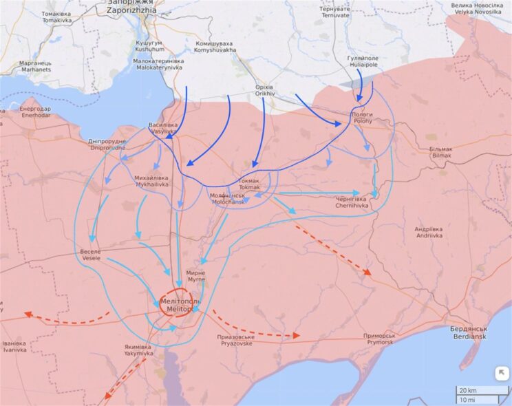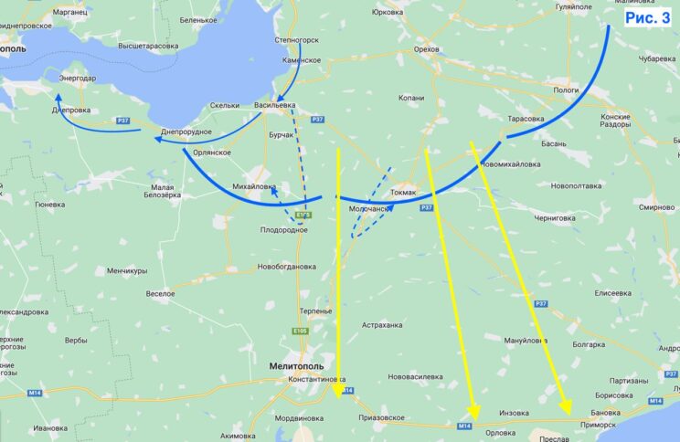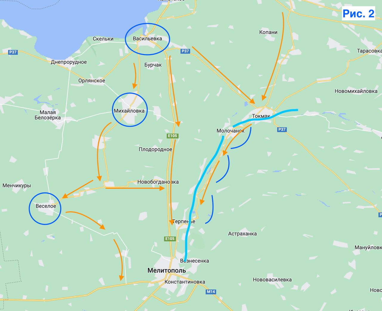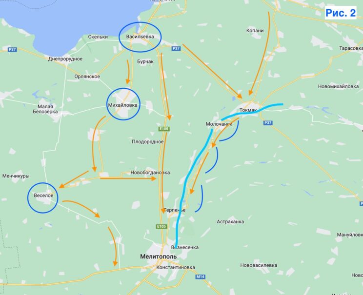 Üldiselt kõlab pealetungi ülesanne nii – jõuda Molotšnõi jõe suudmesse ja katkestada kõik idast läände suunduvate Vene armee varustusteed. Tokmaki ja Melitopoli linnade hõivamise või blokeerimisega . Loomulikult ei pruugi pealetung toimuda kõikides suundades korraga. Siin kujutasin pigem vägede liikumise võimalikke trajektoore. Kõige keerulisem saab olema muidugi alguses kaitsest läbimurdmisel ja lõpus Melitopol mis on suur linn ja kindlasti kaitseb seda arvestatav garnison. Sellele pole lihtne läheneda. Idast katab linna Molotšnaja jõgi, läänest Taschenaki jõgi. Molotšnaja jõgi üldiselt võib mängida rünnakus otsustavat rolli. Võtmerolli mängib kiirtee E105, mida mööda on väga mugav varustada Ukraina vägesid. Aga lisaks on teed P37 ja T0408-T0401. Neid saab kasutada, kui vabastada Tokmaki.