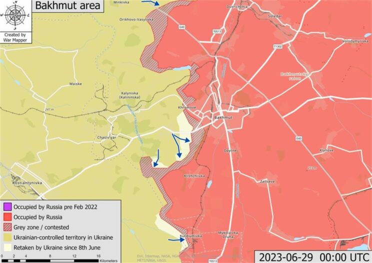 Ukraina väed viisid 29. juunil läbi pealetungioperatsioone veel vähemalt kahes rindesektoris ja saavutasid väidetavalt edu. Ukraina kindralstaap teatas, et Ukraina väed haarasid „strateegilise initsiatiivi“ Bahmuti suunal ja korraldavad praegu laialdast pealetungi piirkonnas. Vene ja Ukraina väed jätkasid piiratud maapealseid rünnakuid Kreminnast lõuna pool samas vene rünnakute intensiivsus selles piirkonnas on vähenenud.