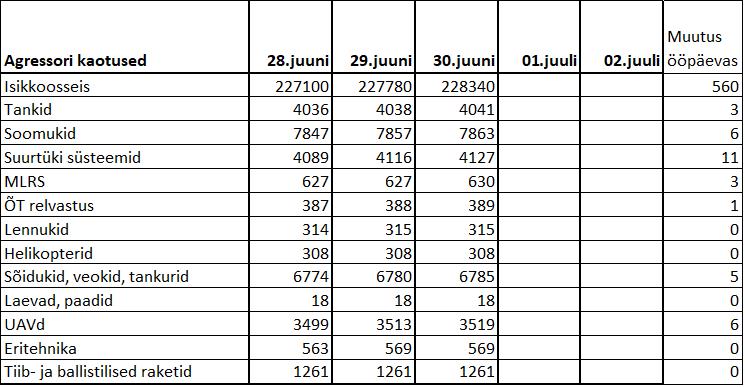 Operatiiv- ja sõjaga seotud info 30. juunil