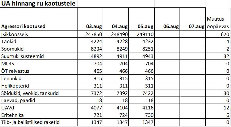 - UA siseministri asetäitja Leonid Tõmtšenko: Siseministeerium tuvastas üle 60 000 venelase, kes hävitati Ukraina sõja ajal. Andmed Ukrainas hävitatud sissetungijate kohta on avalikult kättesaadavad. Tema sõnul on 4. augusti seisuga “Poter.NET” veebilehel info 61 431 tuvastatud Ukraina territooriumil hukkunud okupandi kohta.