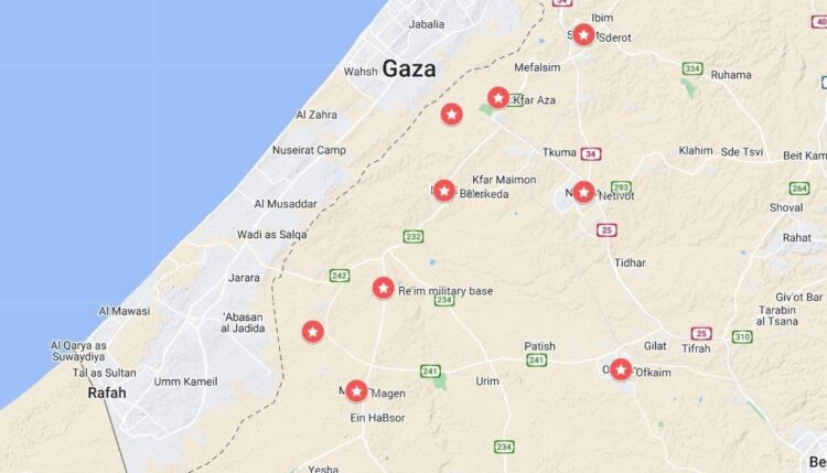 - IDF andis umbes 15 Gaza sektori piiri äärsele asulale käsu koheselt evakueeruda. IDF teatas, et evakueerib tsiviilisikuid järgmistest linnadest: Nahal Oz, Erez, Nir Am, Mefalsim, Kfar Aza, Gevim, Or Haner, Ibim, Netiv Ha’asara, Yad Mordecai, Karmia, Zikim, Kerem Shalom, Kissufim, Holit , Sufa, Nirim, Nir Oz, Ein HaSlosha, Nir Yitzhak, Be’eri, Magen, Reim, Sa’ad ja Alumim.