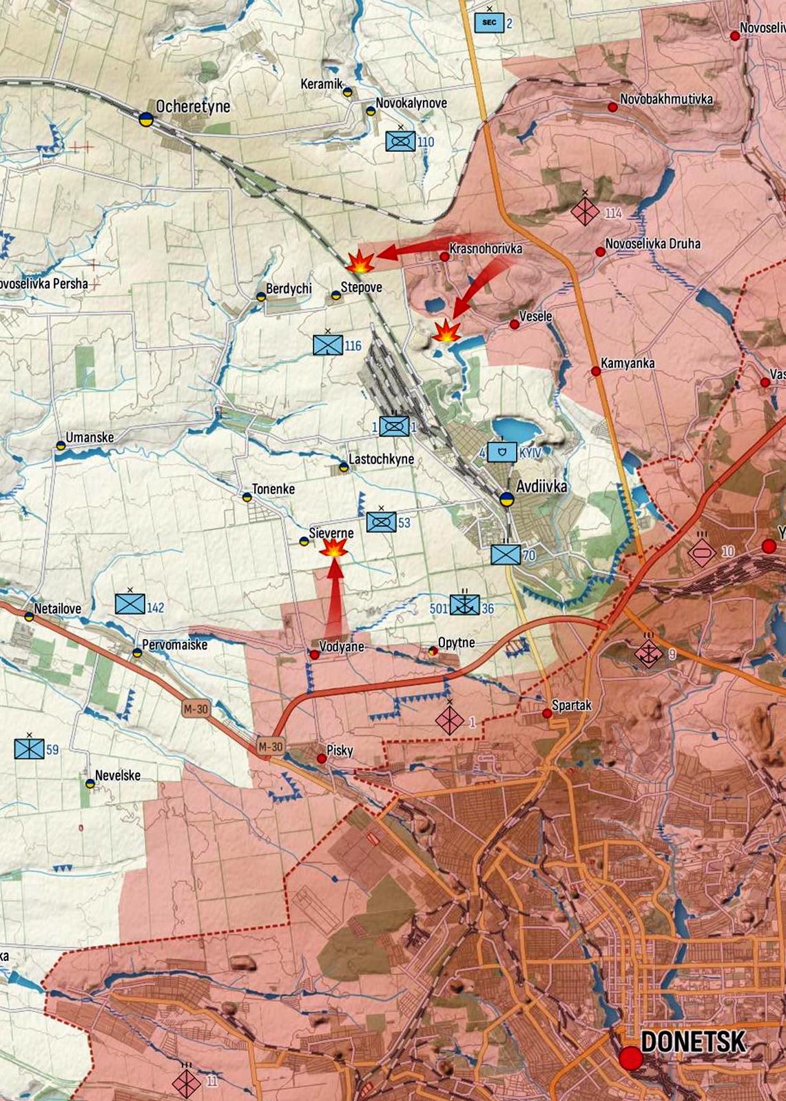 Avdiivka suunal Ukraina kaitsjad hoiavad vapralt joont, tõrjusid 10 vaenlase rünnakut Avdiivka lähedal ja veel 10 rünnakut Stepovest idas, Sjevernest kagus ja Pervomaiskest (Donetski oblastist) lõunas. Vene väed liikusid Krasnohorivka suunast Avdiivka poole ja neid tabas täpne suurtükitule. Vaenlane üritas samuti Stepove poole edasi liikuda, kuid sisenes Ukraina miiniväljale. Samuti trügisid Sieverne poole ja on pidama jäänud külast eemal.