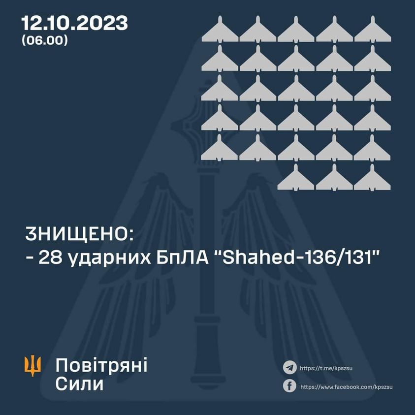 Öösel vastu 12. oktoobrit ründas vaenlane Ukrainat Shahed UAV’ga põhja- ja lõunasuunalt – Bilgorodi piirkond (RF) ja Chauda neemelt (TOT Krimm). Kokku registreeriti 33 drooni. Ukraina õhutõrje töötas vähemalt kuues Ukraina piirkonnas. Kokku hävitati täna öösel õhuväe jõudude ja vahenditega koostöös Ukraina kaitseväega 28 “Shahed-131/136”.