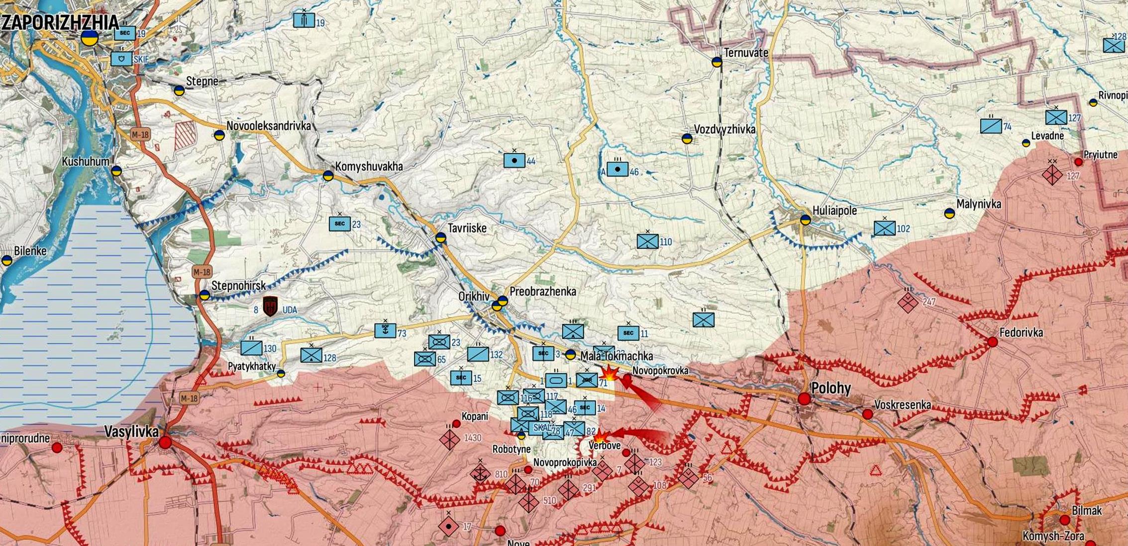 Zaporižži suunal Ukraina kaitsjad hoiavad okupante tagasi Novodarivka ümbruses ja Mala Tokmachkast (Zaporižži oblast) ida pool. Vene väed alustasid lokaliseeritud vasturünnakut ja tõrjusid Ukraina väed Verbove asulast eemale. Kahjuks võtsid nad rünnaku käigus vangi ka mõned Ukraina sõdurid.