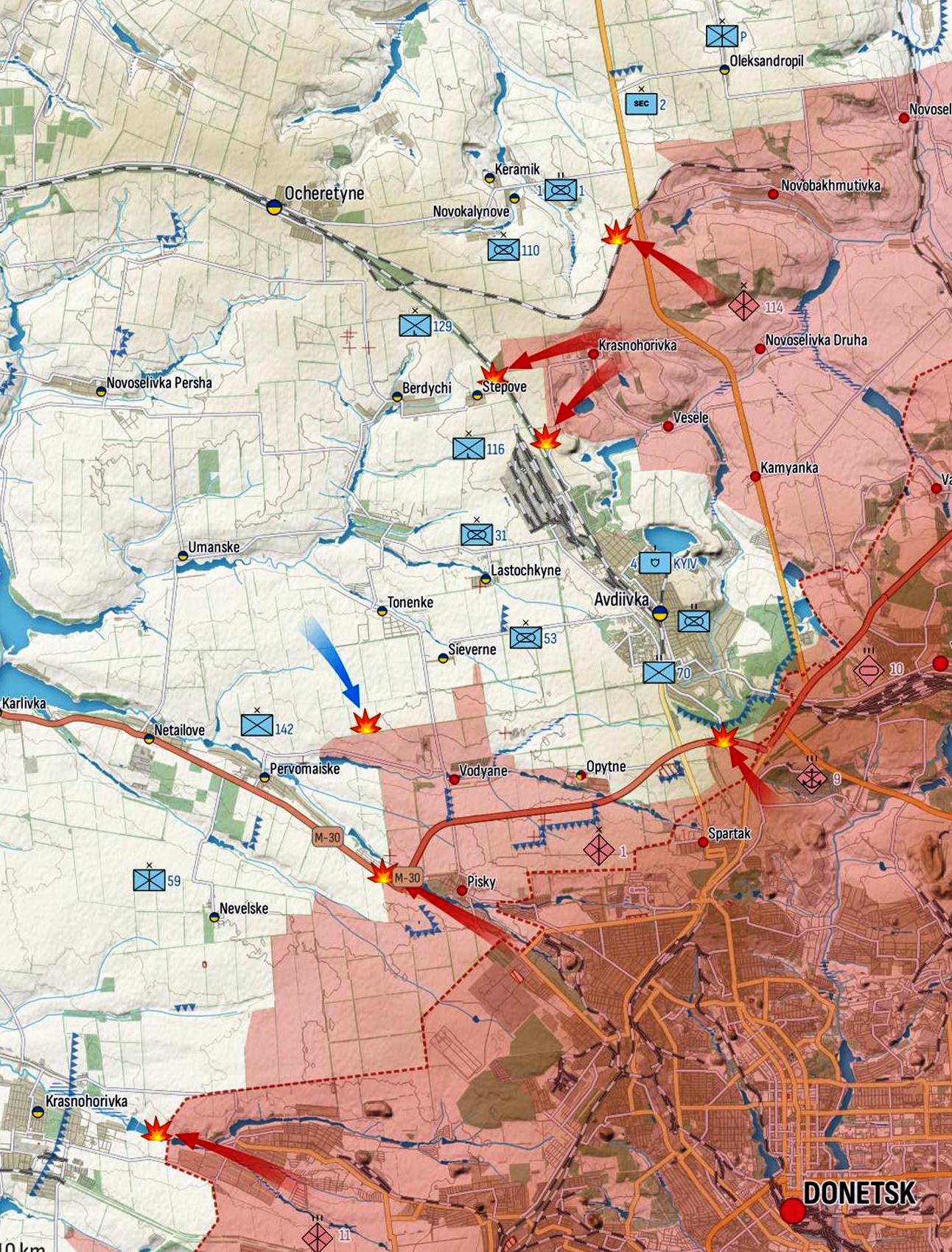 Avdiivka suunal vaenlane üritab Avdiivkat ümber piirata, kuid Ukraina sõdurid seisavad kindlalt, tekitades vaenlasele suuri kaotusi. Vastase ründeoperatsioonid Keramiku, Stepove, Tonen’ke ja Pervomais’ke (Donetski oblast) ümbruses olid ebaõnnestunud. Ukraina kaitsejõud tõrjusid selles piirkonnas enam kui 15 vaenlase rünnakut. Sissetungiväed jätkavad rünnakuid Stepove suunas, tabades Ukraina miinivälju ja valmistades ette kaitsepositsioone. Venelased saavutasid Avdiivkast põhja pool asuva tööstuspiirkonna suunas väikese edu. (allikas) Ukraina kaitsjad alustasid Sievernest edelas lokaliseeritud vasturünnakut. Näib, et Ukraina väed suutsid taastada kontrolli varem kaotatud positsioonide üle. (allikas)