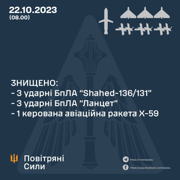 Täna öösel hävitas UA õhutõrje kolm Shahed ründedrooni, ühe Kh-59 raketi ja kolm ründerdrooni Lancet. Venelased tulistasid Belgorodi oblastist ja ajutiselt okupeeritud Donetski oblasti territooriumilt välja kaheksa S-300 raketti.