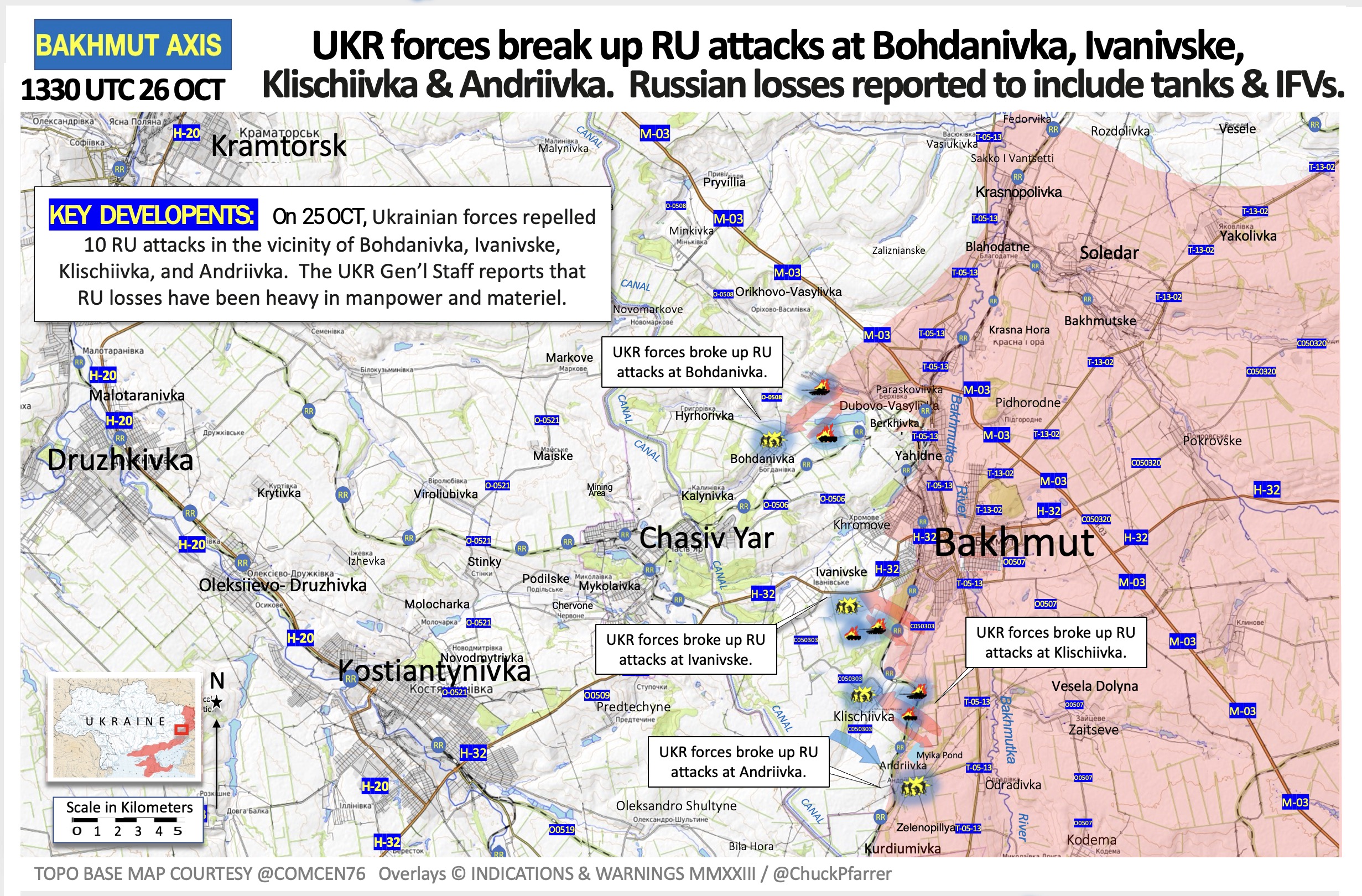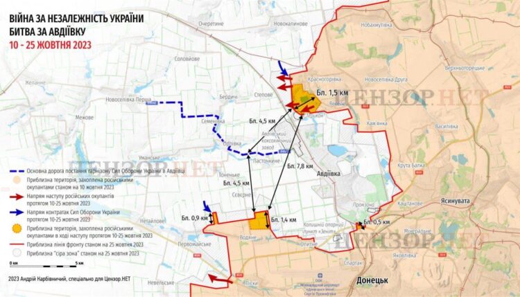 - 25. oktoobril jätkas Vene väejuhatus rünnakuoperatsioone kogu Avdiivka piirkonnas ning kitsas koridoris Krasnohorivka külast linnast põhja poole. Vene jalaväelasi rünnati igasuguste relvadega ja vaenlane oli selgelt näha. Venelased asendasid hävitatud rünnaküksusi ning viisid lahingusse reservid. 110. mehhaniseeritud brigaad tõrjus edukalt kõik rünnakud otse Avdiivkale. Olukord Avdiivkast põhja pool on aga tõsiselt eskaleerunud. Vaatamata suurtele kaotustele tungisid Vene ründeüksused Avdiivkast põhja pool mööda raudteed ja hõivasid kuni 1 km laiuse ala, püüdes laiendada kontrollitavat koridori ning luua tingimusi vägede koondamiseks ja edasiseks pealetungiks Stepove-Berdychi suunal ja Avdiivka koksi- ja keemiatehase (AKHZ) tööstuspiirkonnas. See on väga tõsine oht, mis nõuab maksimaalset tähelepanu. Vaenlane loodab tehasehoonetes kanda kinnitada ja linna sisenemiseks sillapea luua. Lõuna pool kuni Avdiivka jätkavad Vene väed rünnakuid Opytne küla lähedal asuva liivakarjääri hõivamiseks. Avdiivka on Ukraina jaoks palju suurema strateegilise tähtsusega kui isegi Bakhmut. Vene väejuhatus tahab siin iga hinna eest edu näidata. Siinne taktikaline olukord on Venemaa löögijõudude hävitamiseks väga soodne. Kuid UA eelised tuleb täielikult realiseerida. Vene jalaväge ei peaks peatama mitte mundris inimeste arv või erinevate üksuste ja lippude arv kaardil, vaid hästi organiseeritud, koordineeritud ja kontrollitud värsked üksused. Ja kõiki selliseid reserve on siin vaja, et hävitada venelased kitsas koridoris, kus nad võitlevad. Olukord Avdiivkas on eskaleerumas ja siin käib lahing, millesse vaenlane kaasab oma põhijõude. Lahing, mille võitmiseks on UA’l kõik võimalused oma jõudude vajaliku koondamisega.