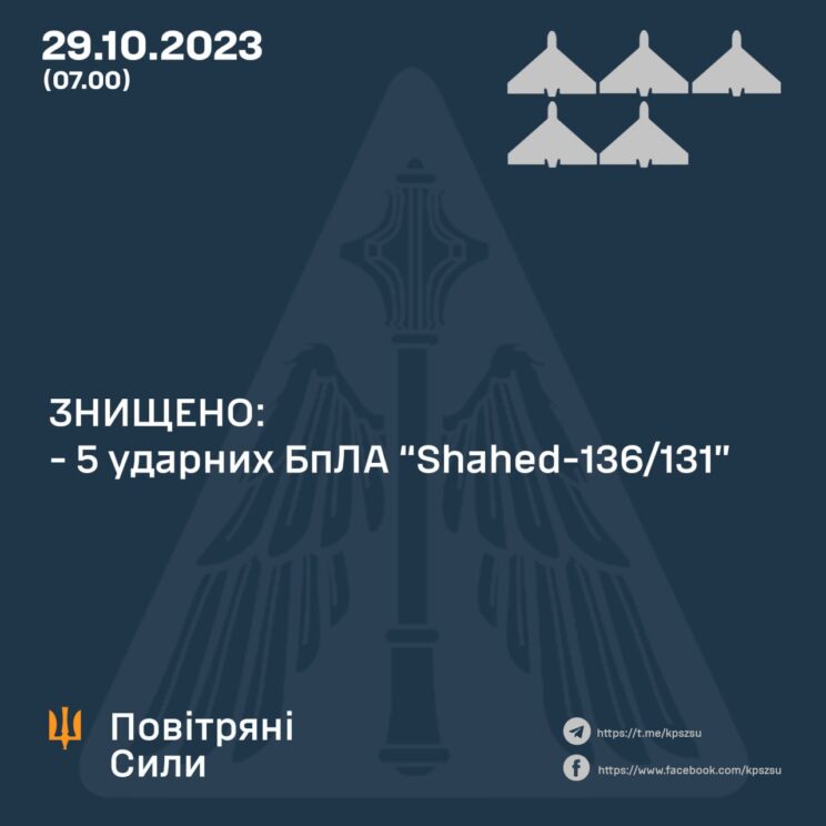 • Hmelnitski oblastis oli kuulda plahvatusi, teatab TSN, viidates piirkonna sõjaväeadministratsiooni juhi esimesele asetäitjale Sergei Tjurinile. Piirkonnas on õhutõrje. Enne seda kuulutati seal välja õhurünnaku häire. Võimud palusid elanikel varjuda. Öösel kõlasid häired ka Tšerkassõs, Kirovogradis, Tšernigovis, Sumõs, Nikolajevis ja teistes Ukraina piirkondades.