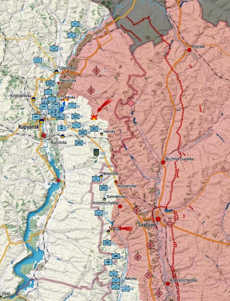 Kupjansi suunal vaenlane viis läbi edutuid rünnakuoperatsioone Synkivka ja Ivanivka (Harkivi oblast) ning Stelmakhivka (Luganski oblast) ümbruses. Ukraina kaitsjad tõrjusid piirkonnas 8 rünnakut. Pärast kaks nädalat tagasi Lyman Pershyi lõuna poole liikunud UA on nüüdseks samuti arenenud Synkivkast põhja pool asuvasse halli tsooni. Allikate sõnul vallutas agressor rohkem maad Ivanivka asulast loodes. Ukraina väed varitsesid läbi okupeeritud Raihorodka Nadija poole liikunud Vene konvoi, hävitades mitu sõidukit.