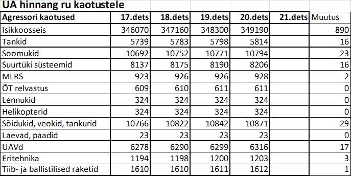 - UA Relvajõudude kaotused alates “SVO” algusest ulatusid 383 000 hukkunu ja haavatuni. Vastupealetungi käigus kaotas Ukraina 159 000 inimest, 121 lennukit, 23 helikopterit, 766 tanki, sealhulgas 37 Leopardi, 2348 soomukit, millest 50 Bradleyt;