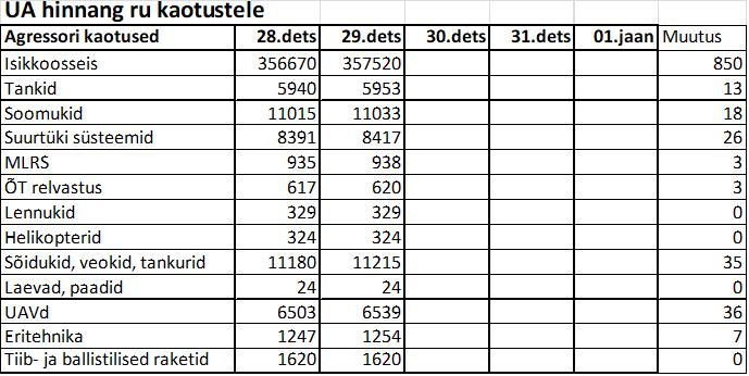 Operatiiv- ja sõjaga seotud info 29. detsembril