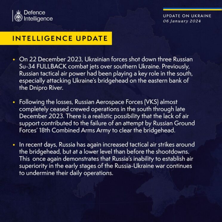 - Briti luureraport. On reaalne võimalus, et õhutoetuse puudumine viis Venemaa maavägede 18. ühendrelvaarmee ebaõnnestumiseni idakalda sillapea vabastamisel, usuvad Briti eksperdid. Venemaa on viimastel päevadel taas intensiivistanud taktikalisi õhulööke sillapea ümber, kuid mitte nii intensiivselt kui enne lennukite allatulitamist. See näitab taas, et Venemaa suutmatus sõja algfaasis õhuülekaalu kehtestada õõnestab jätkuvalt nende igapäevast tegevust.