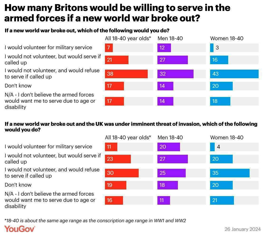 - Suurbritannias ainult 20% meestest (18-40-aastased) läheb vabatahtlikuks ja 27% mobiliseeritakse ajateenistuse teel otsese kallaletungimise ohu korral. Naiste toetuse tase on vastavalt 4% ja 20%. 30% inimestest keelduks ajateenistusest.